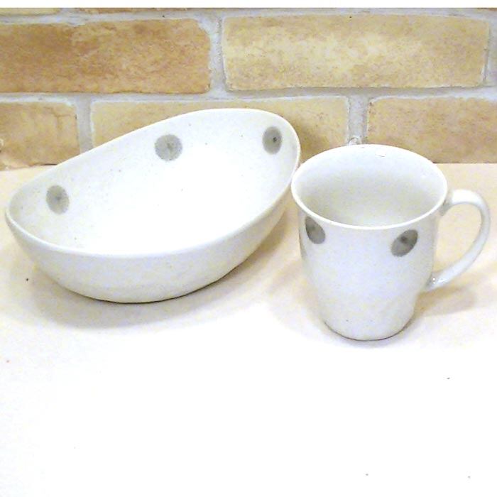水玉柄のカレー皿とカップのペアセットです。